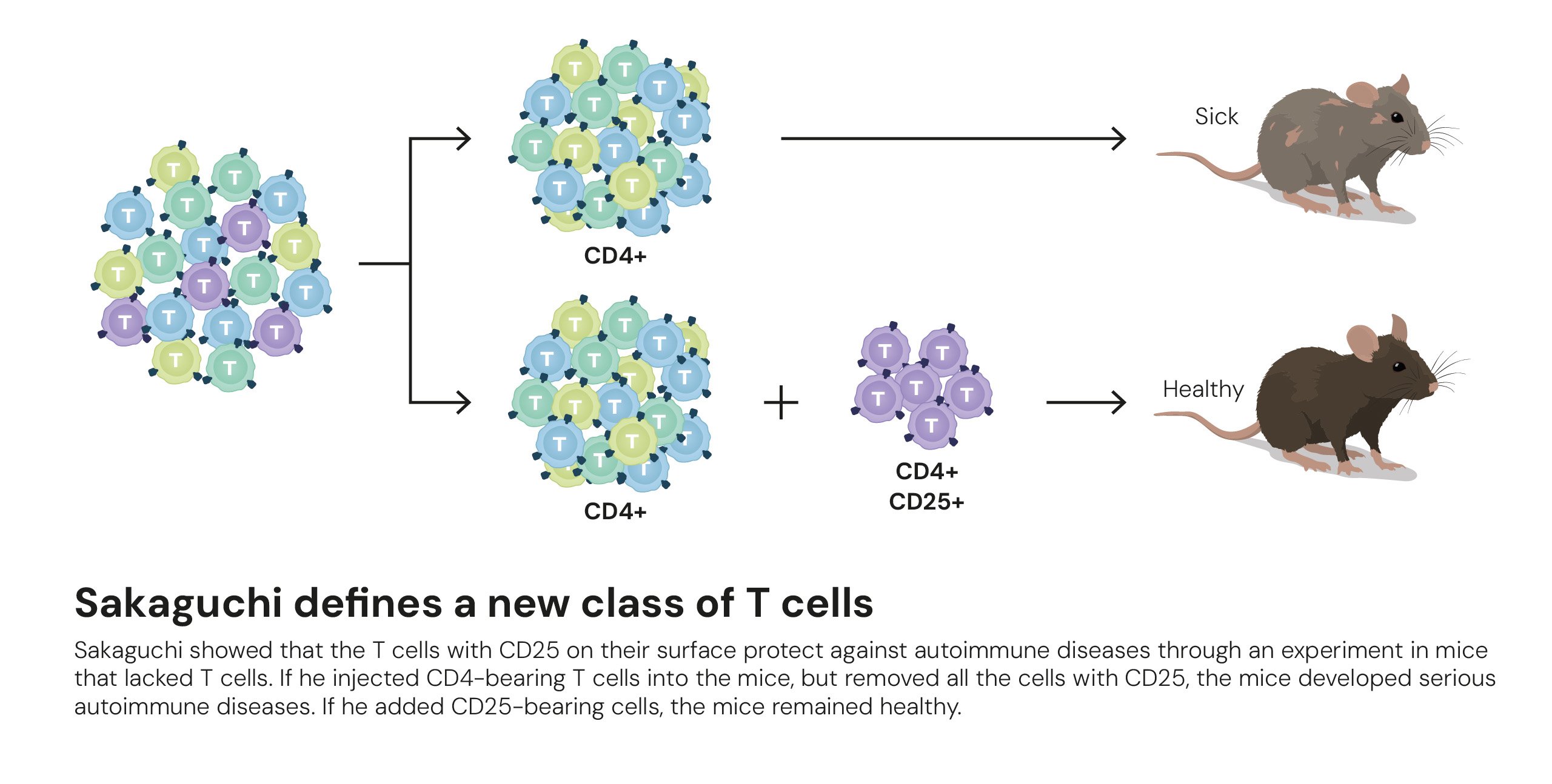Две години по ова, Шимон Сакагучи успеал да ги поврзе овие откритија. Тој докажал дека генот Foxp3 го регулира развојот на клетките што ги идентификувал во 1995 година. Овие клетки, сега познати како регулаторни Т-клетки, ги следат другите имунолошки клетки и обезбедуваат нашиот имунолошки систем да ги толерира нашите сопствени ткива.