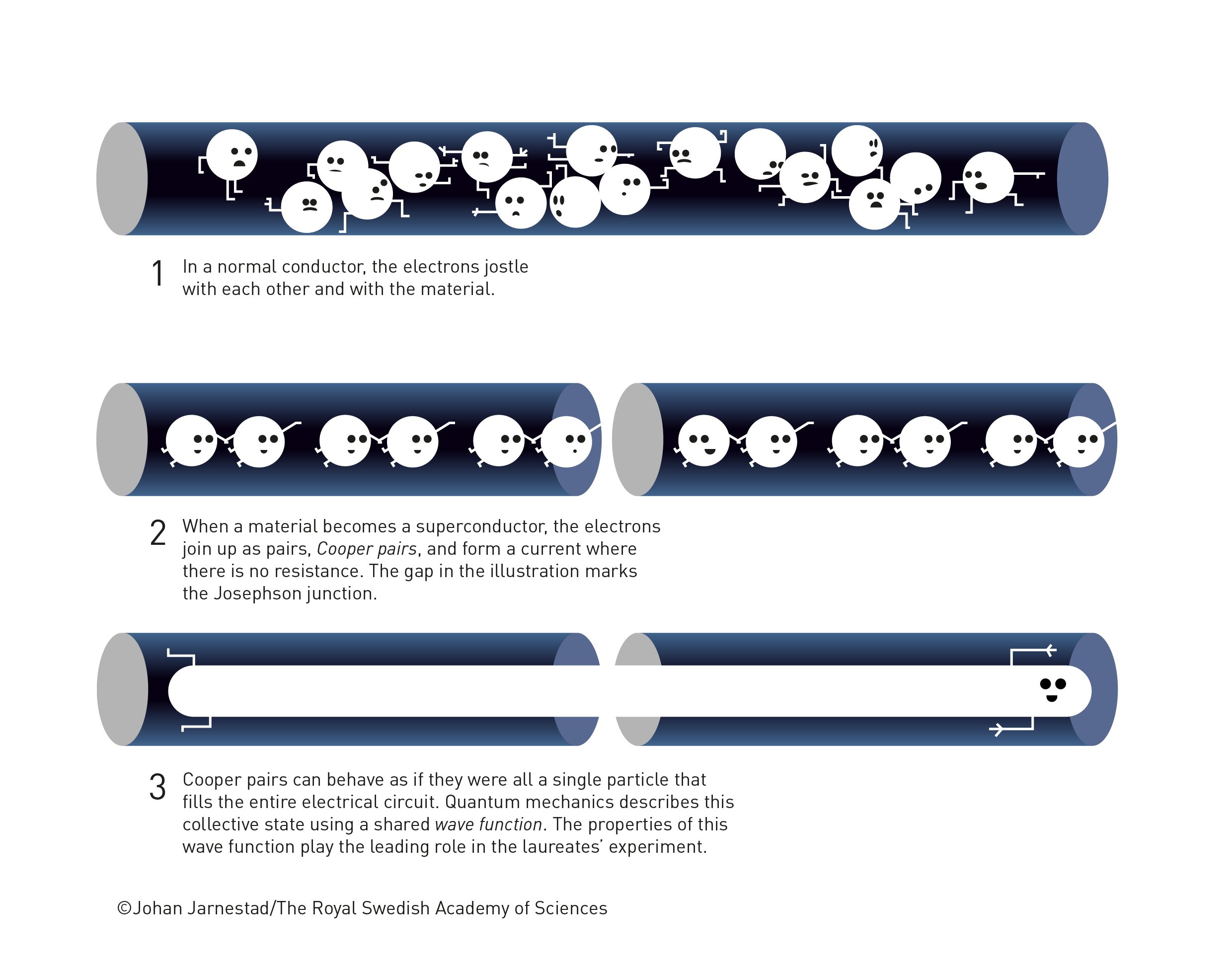 Квантната механика ѝ овозможува на честичката да се движи директно низ бариера, користејќи процес наречен тунелирање. Кога се опфатени голем број честички, квантно-механичките ефекти обично стануваат незначителни. Експериментите на лауреатите покажаа дека квантно-механичките својства можат да се направат конкретни на макроскопско ниво.