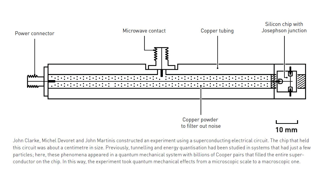 Главно прашање во физиката е максималната големина на систем што може да демонстрира квантно-механички ефекти. Овогодишните лауреати на Нобеловата награда спроведоа експерименти со електрично коло во кои демонстрираа и квантно-механичко тунелирање и квантизирани нивоа на енергија во систем доволно голем за да може да се фати во рака.