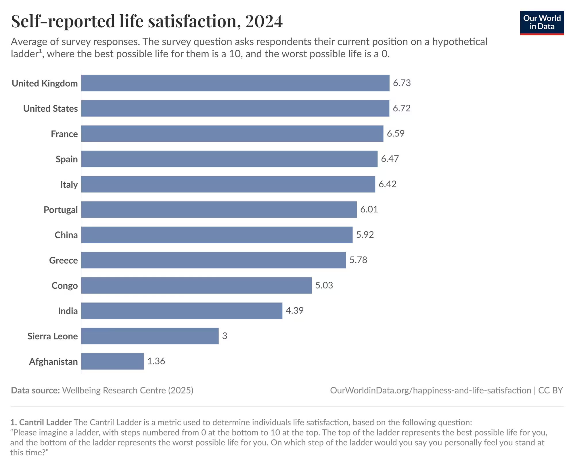 (Делумни) резултати од анкета од Светскиот извештај за среќа 2025, кои се однесуваат на 2024 година. Резултатите се претставени на скала за лична благосостојба со поени од 0 до 10 и се резултат на просекот од одговорите на учесниците. Слика: OurWorldinData | Wellbeing Research Centre