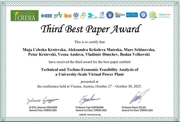 Трудот на истражувачи од Факултетот за електротехника и информациски технологии – ФЕИТ, со наслов „Technical and Techno-Economic Feasibility Analysis of a University-Scale Virtual Power Plant“, е добитник на Third Best Paper Award на меѓународната конференција ICRERA 2025 – International Conference on Renewable Energy Research and Applications, одржана во Виена, Австрија, во периодот од 27 до 30 октомври 2025 година.
