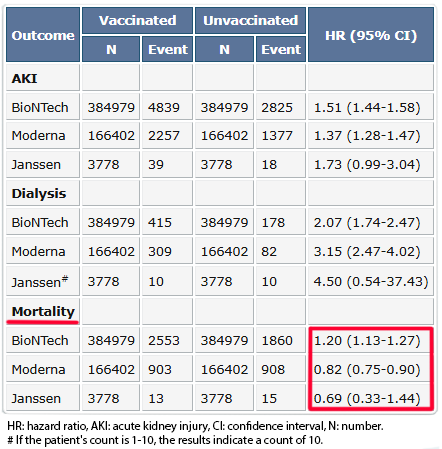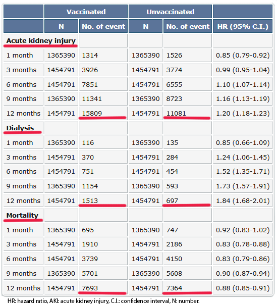 Како што се гледа, вакцинираната група има поголеми стапки на акутно бубрежно оштетување, дијализа и смртност од која било причина.