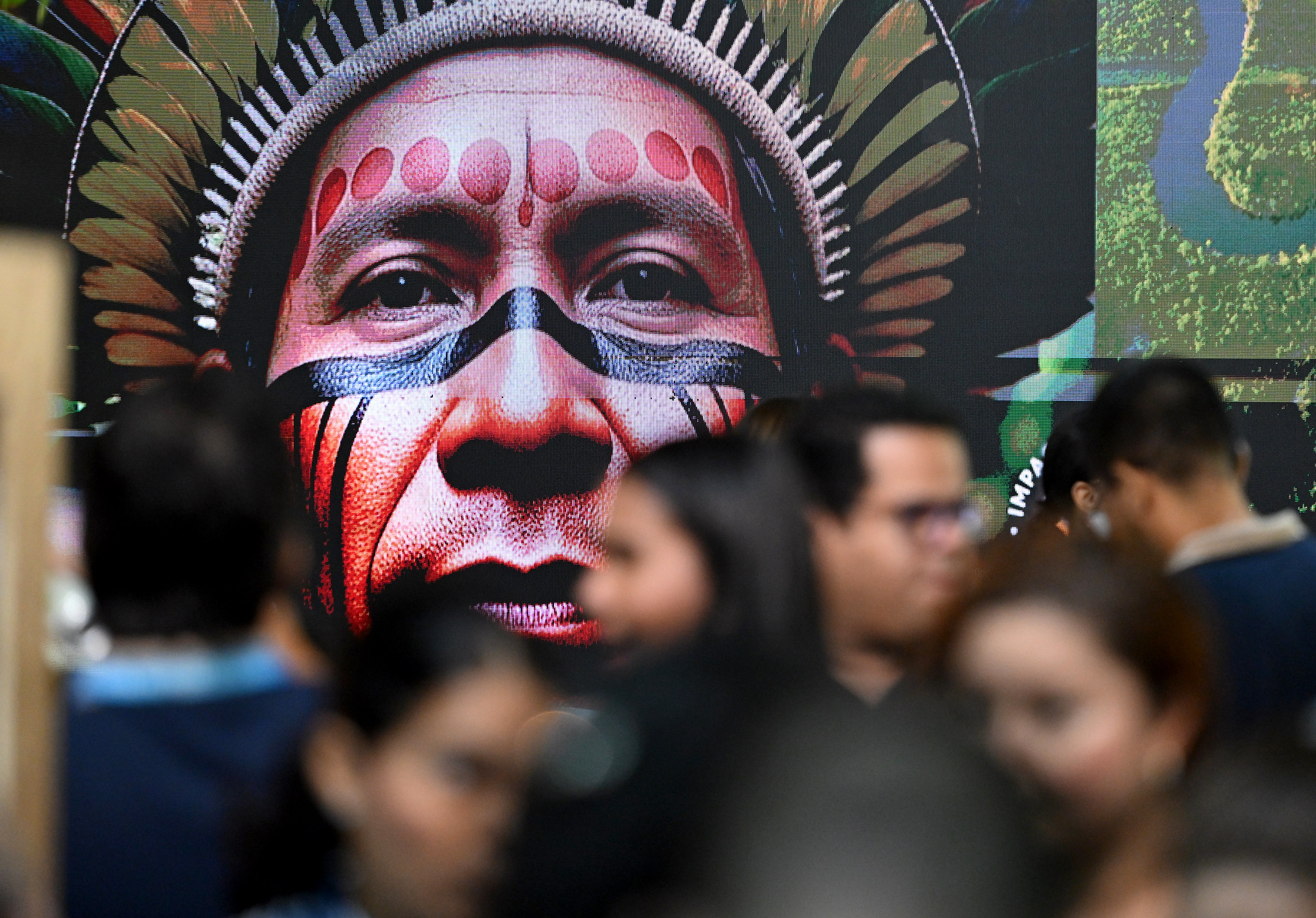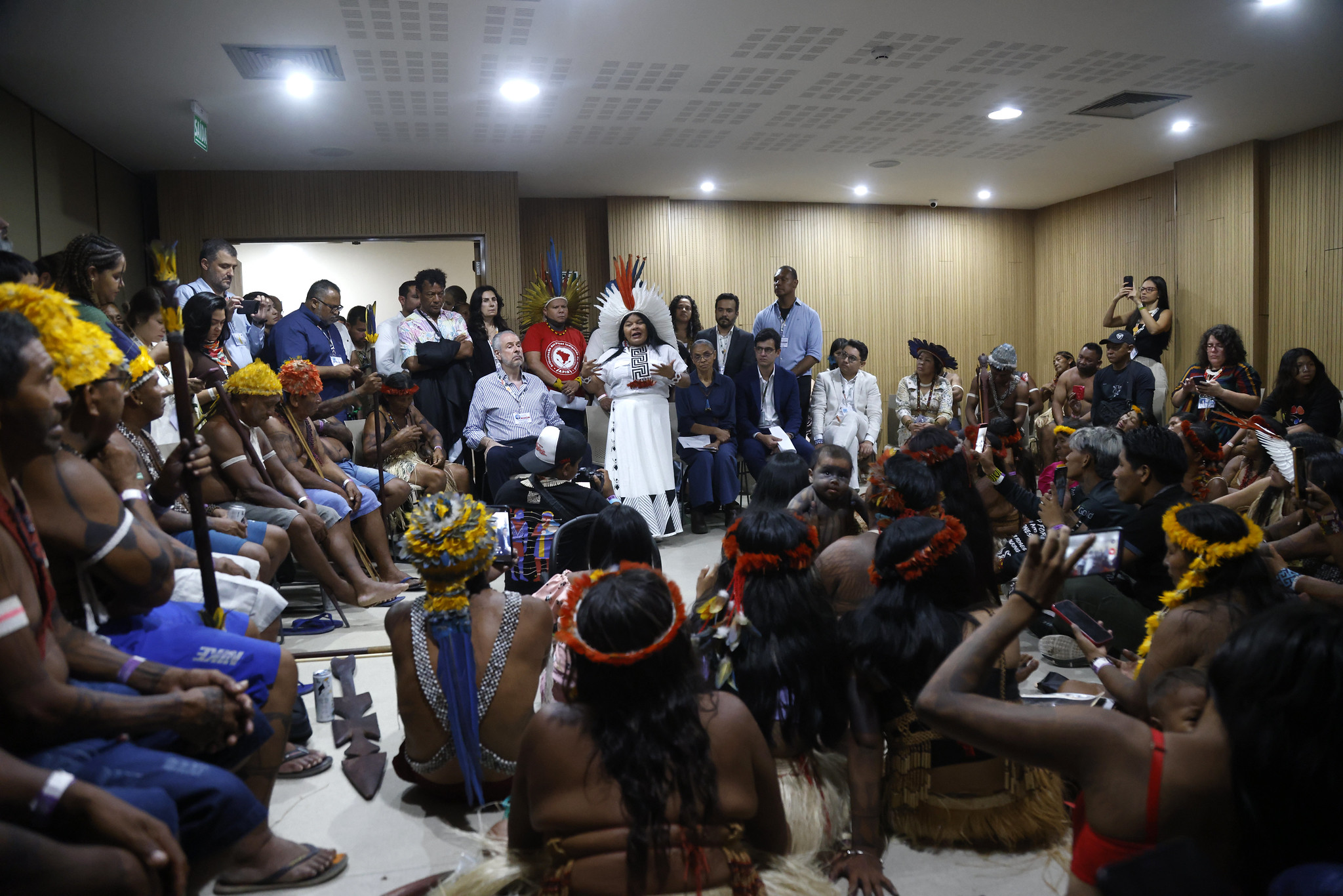 14.11.2025, Белем. Претседателот на COP30, Андре Кореа до Лаго, Соња Гуахахара, министерка за домородните народи на Бразил, и Марина Силва, државна министерка за животна средина и климатски промени на Бразил, присуствуваат на состанок со домородните народи на 30-тата Конференција на страните (COP30) Фото: Ермес Карузо/COP30