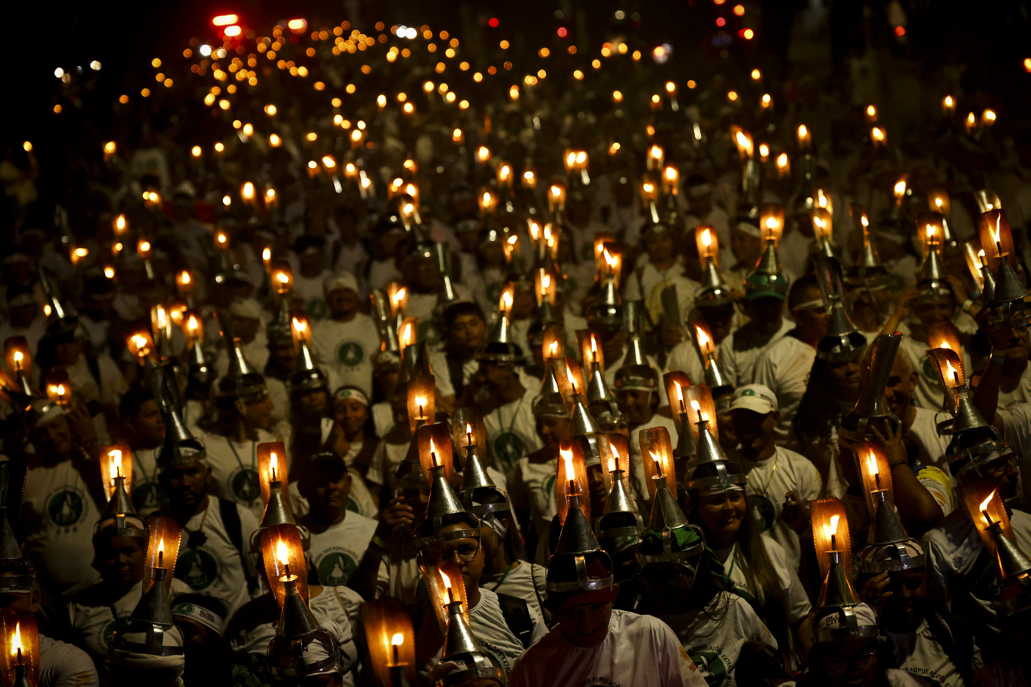 13.11.2025, Белем. Активисти за време на маршот 'Поронгасо' на Шумските луѓе. Името 'Поронгасо' доаѓа од поронгата, маслената ламба што ја користат работниците за гумени цевководи за време на нивната ноќна работа во шумата. Фото: Уеслеј Марселино/COP30