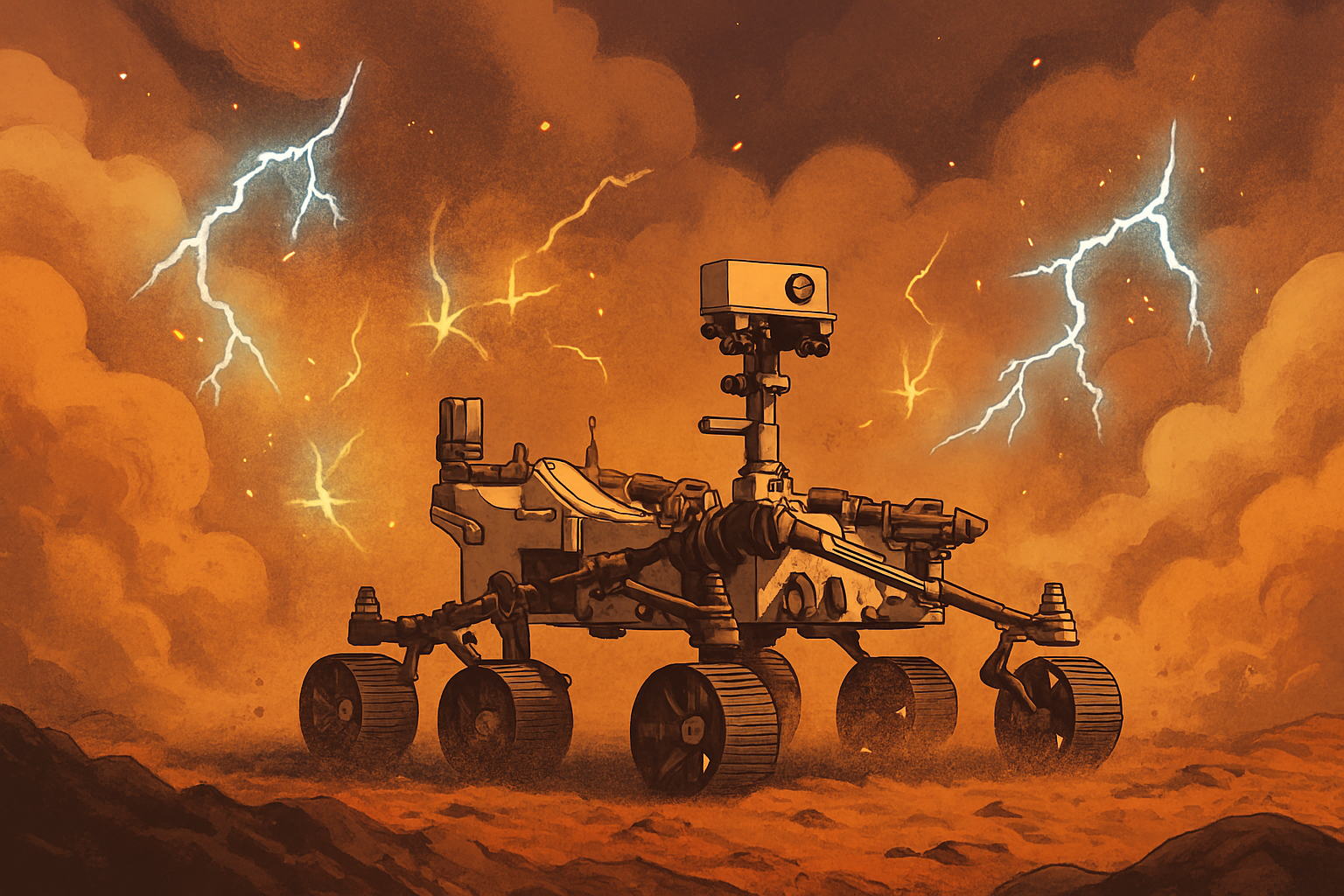 Уметнички приказ на роверот Perseverance во правлива бура на Марс