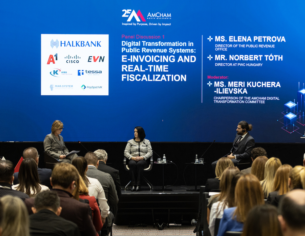 Првата тема беше насочена кон дигиталната трансформација на системите за јавни приходи, каде директорката на Управата за јавни приходи, Елена Петрова, и претставникот на „PwC Унгарија“, Норберт Тот, говореа за придобивките од е-фактурирањето и фискализацијата во реално време, со практични примери и насоки за идната имплементација.