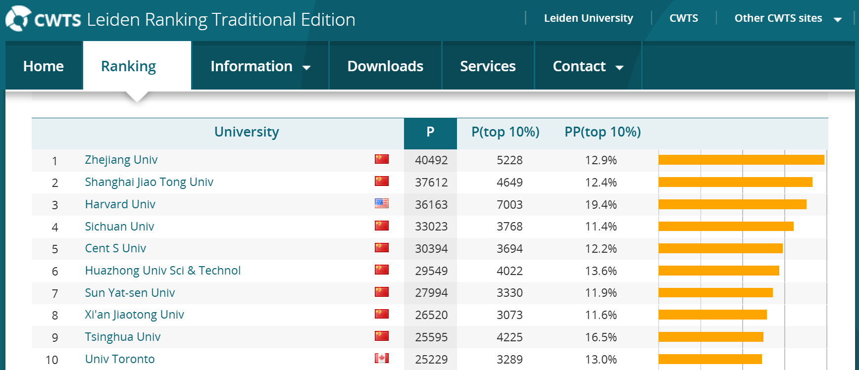 Според податоците на CWTS Leiden Ranking, коишто ги отсликуваат најобјективните анализи на академска продукција, кинескиот универзитет Жеџијанг (Zhejiang University) изби на првото место, надминувајќи го универзитетот Харвард, којшто падна на третата позиција.