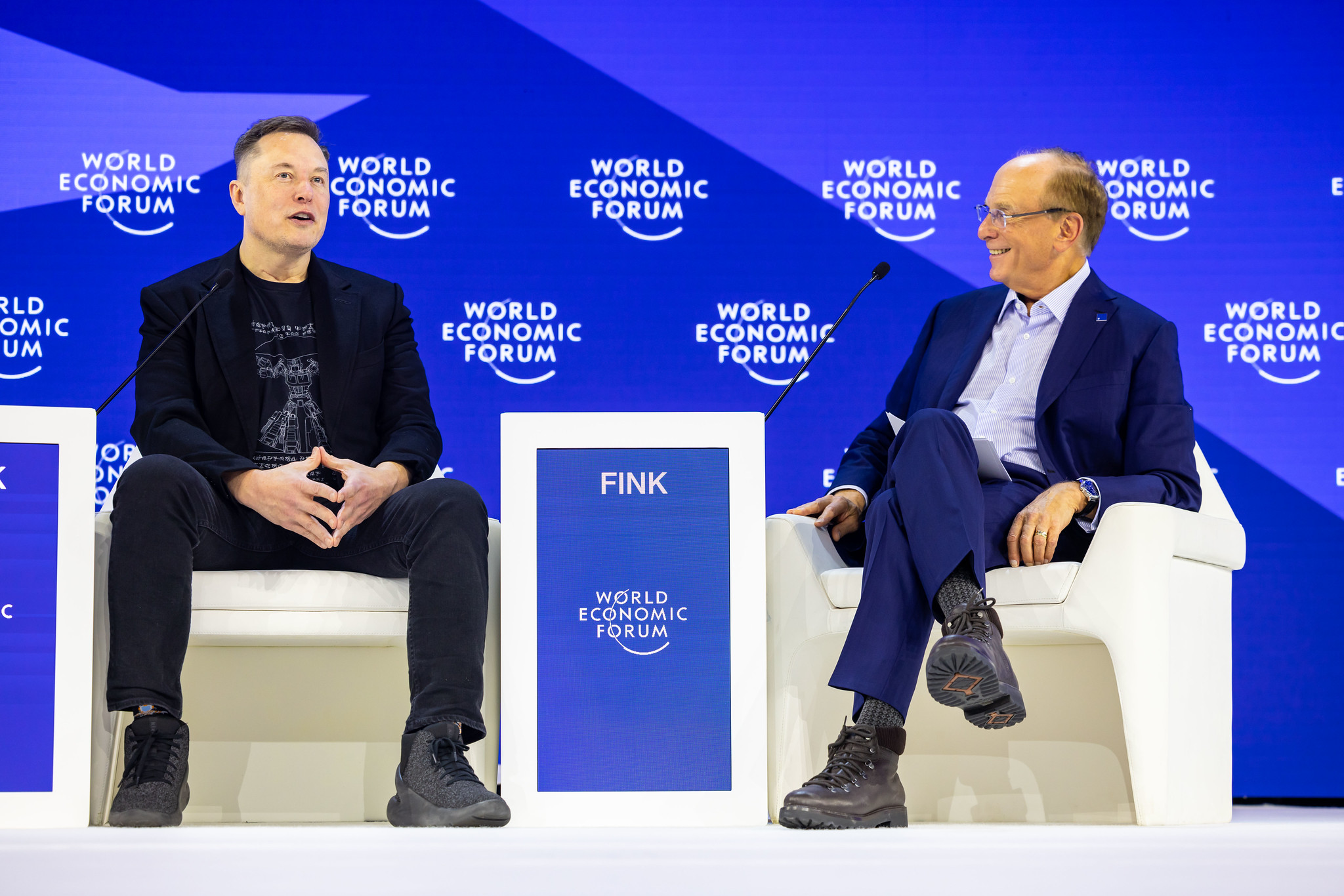 Conversation with Elon Musk session with Elon Musk, CEO, Tesla; Chief Engineer, SpaceX; CTO, xAI; Laurence D. Fink, Chair and CEO, BlackRock; Interim Co-Chair, World Economic Forum; at the Official, on 22/1/2026 from 16:30 to 17:00 in the Congress Centre – Congress Hall (Zone C), Plenary. (conversation/musk). ©️2026 World Economic Forum / Ciaran McCrickard