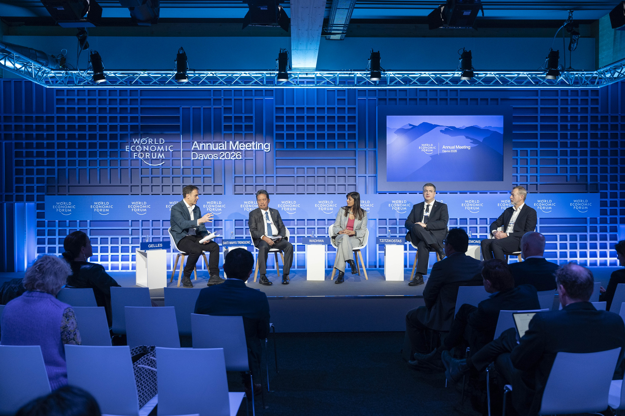 Velocity of the Blue Economy session with Apostolos Tzitzikostas, Commissioner for Sustainable Transport and Tourism, European Commission; Boudewijn Siemons, Chief Executive Officer, Port of Rotterdam, Netherlands; David Gelles, Managing Correspondent, New York Times, USA; Meenakshi (Meena) Wadhwa, Director, Scripps Institution of Oceanography, University of California, San Diego, USA; Sakti Wahyu Trenggono, Minister of Marine Affairs and Fisheries of Indonesia; Subaih Abdul Aziz Al-Mukhaizeem, Minister of Electricity, Water and Renewable Energy and Minister of Finance and Acting Minister of State for Economic Affairs and Investment of Kuwait; at the World Economic Forum Annual Meeting 2026 in Davos-Klosters, Switzerland, on 22/1/2026 from 09:00 to 09:45 in the Kurpark Village – Aspen 4 (Zone K), Stakeholder Dialogue. (ocean-positive business). ©2026 World Economic Forum / Thibaut Bouvier