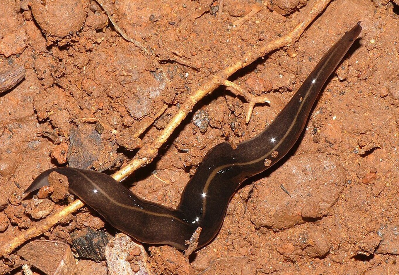 Предаторскиот црв Platydemus manokwari на островите Огасавара, со глава десно, должина околу 8 см. Заедно со розовите волчји полжави и стаорците, овие инвазивни плоснати црви имале разорно влијание врз популациите на копнени полжави низ Тихиот и Индискиот Океан. Фото: С. Сугиура.