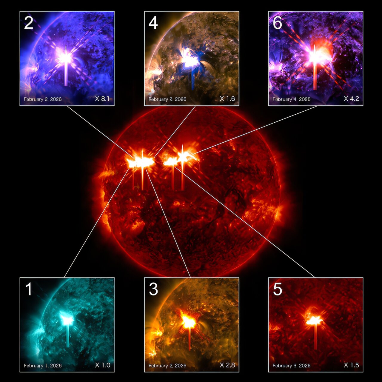 Шест сончеви блесоци еруптираа од 1 до 4 февруари 2026 година. Слика: НАСА/СДО