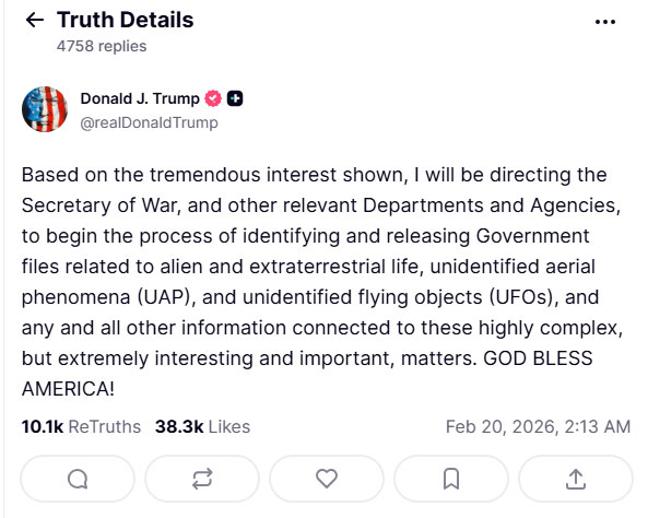 Неодамна американскиот претседател им нареди на Пентагон и федералните агенции да започнат процес на декласификација на документи поврзани со непознати летачки објекти, можен живот надвор од Земјата и сите други поврзани информации, потег што ги врати во центарот на глобалната јавна дебата неидентификуваните воздушни феномени (НВФ) или попознати како НЛО (неидентификувани летечки објекти). Одлуката доаѓа како одговор на „огромниот интерес на јавноста “, истакнаа од Белата куќа во објавата пласирана на социјалната мрежа на Трамп.