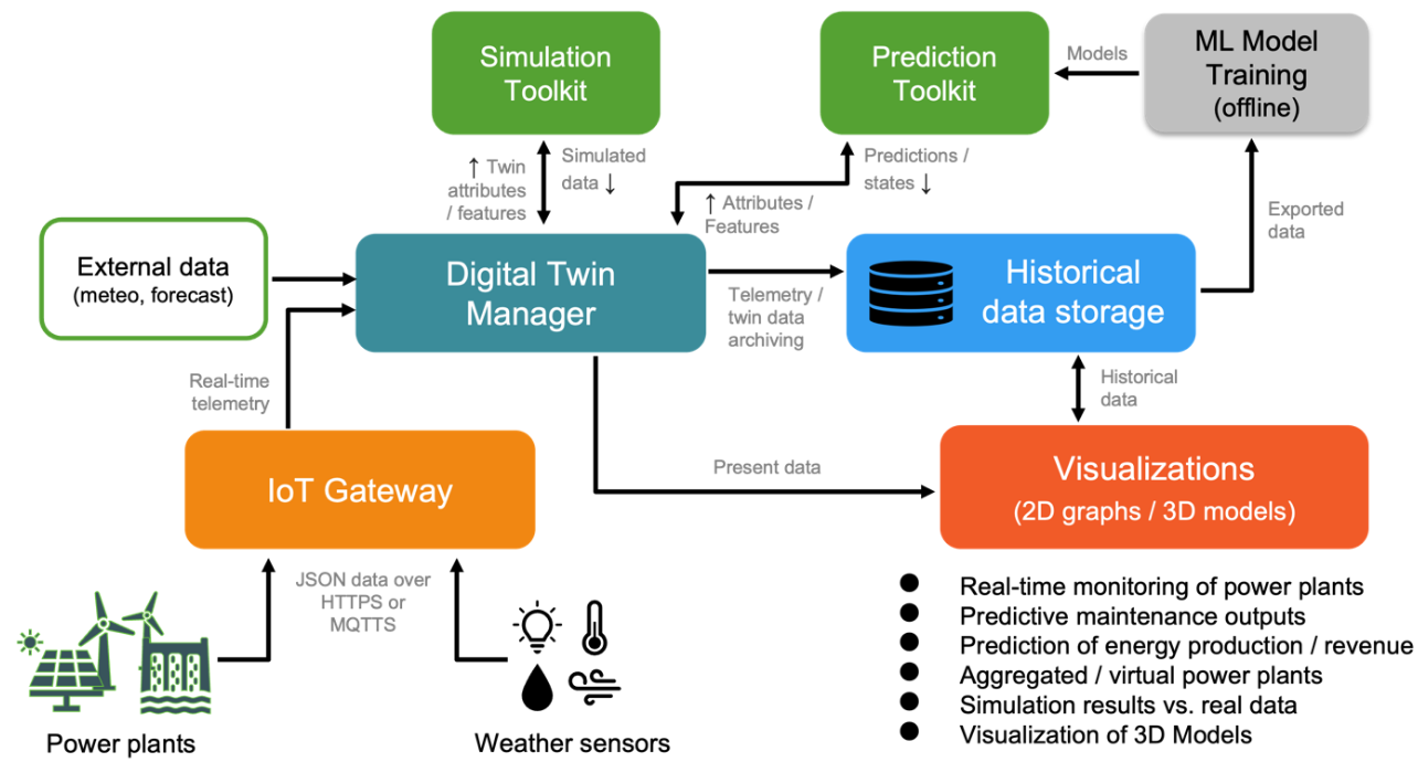 Овој систем сега континуирано прима телеметриски податоци во реално време преку мрежа од напредни софтверски алатки. Поконкретно, Eclipse Hono служи како IoT портал (gateway) преку кој безбедно се поврзуваат уредите. Податоците потоа се процесираат преку Apache Kafka и Eclipse Ditto за да се ажурира точната моментална состојба на дигиталните близнаци. За долгорочно чување на историските податоците се користи InfluxDB, додека за нивна визуелизација и мониторинг се употребуваат интерактивни Grafana контролни табли.